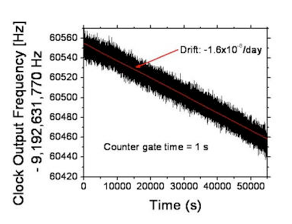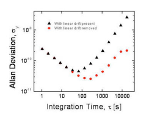 The long-term instability of the frequency reference is determined primarily by a substantial linear drift of the fractional frequency of roughly -2×10-8/day. The drift and corresponding Allan deviation at long integration times are shown below. The origin of this drift is currently not well understood, but we speculate that it is related to chemical processes within the cell that affect the pressure of the N2 buffer gas. One possible process that could explain the observed drift is absorption of N2 by residual Ba remaining in the cell after the chemical reaction that produces the cesium. If this is the case, the drift could be eliminated by fabricating the cells using a process that does not involve barium, for example by use of an atomic beam. Residual long-term fluctuations in the output frequency of the microfabricated atomic clock are thought to be related to changes in the ambient temperature.